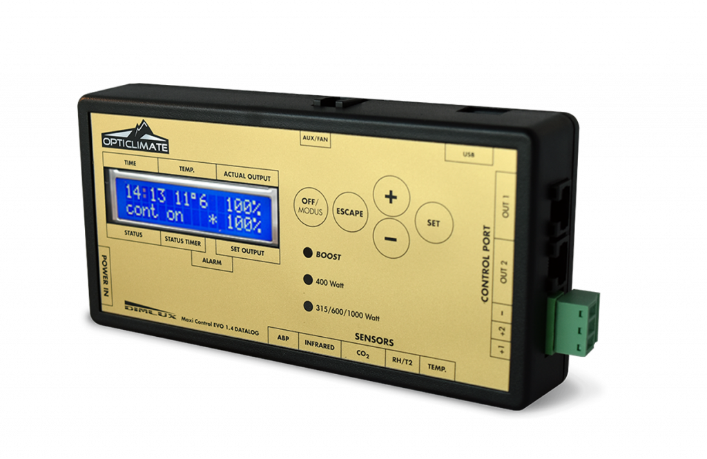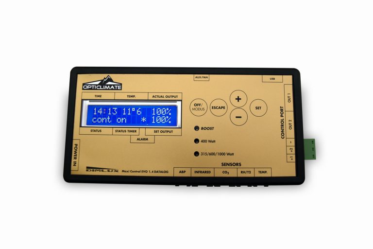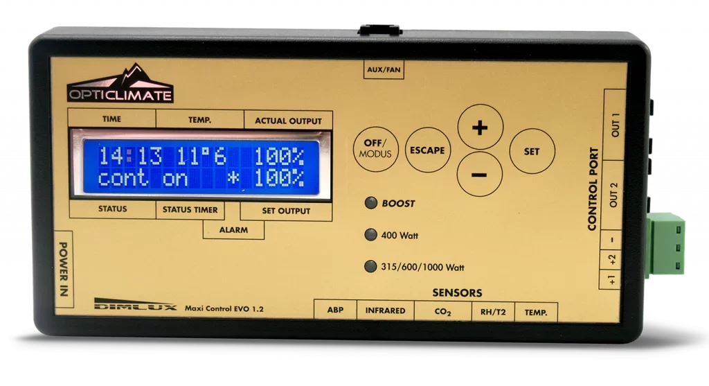 With the Dimlux air humidity sensor, the air humidity can accurately be read from the Dimlux Maxi Controller. If the RH sensor is connected, a humidifier can also be connected to the Dimlux Maxi Controller. To read the VPD, a plant temperature camera is required besides the RH sensor.