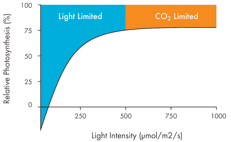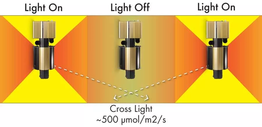 By running Half Force, the grower can strike the optimal point for the plant’s growth while not wasting energy (electrical power) producing light the plant can’t use or convert into a higher yield. Better still the grower doesn’t risk damaging the crop. Because of Dimlux’s superior light output he grower gets the most light possible while they are on, but since they alternate, the plant gets the breather it needs. Cross light ensures a minimum amount of light for the crop directly under the “off fixture”. Beyond this diminished return, the only way to take advantage of additional light past around 500 to 600 μmol is to enrich the environment with CO2. Even then, that methodology only goes so far.