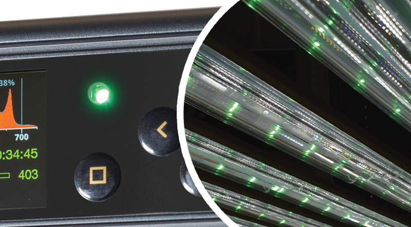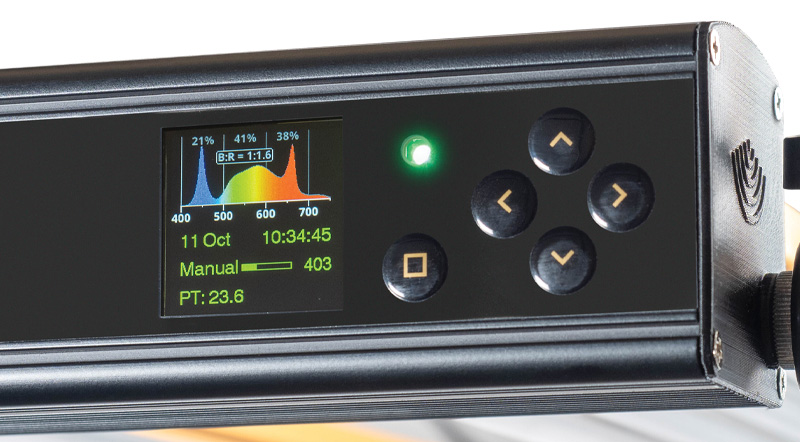 Dimlux LEDs come with an on-board display. It’s used to configure the light when operated stand-alone (no external controller) as well as display the current spectrum.​