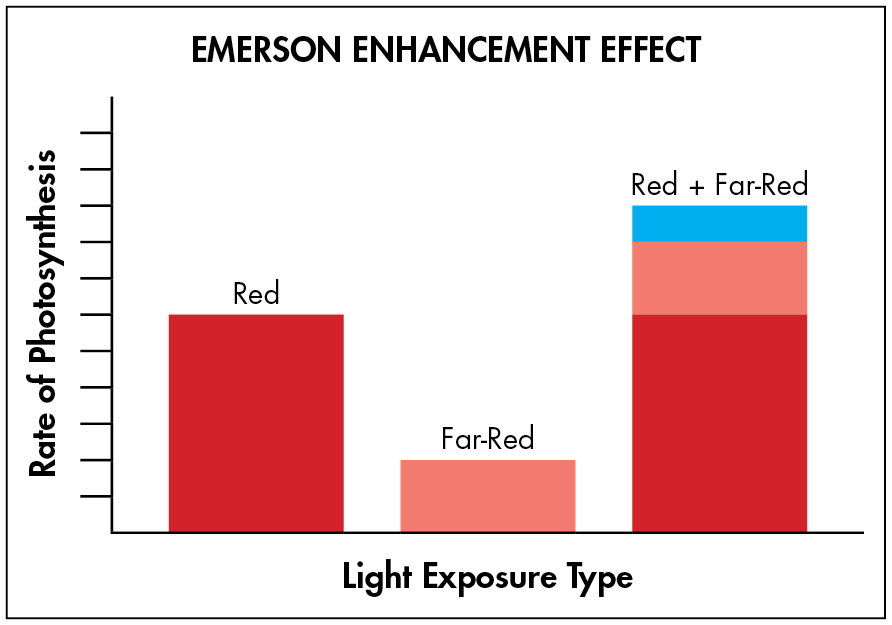Studies have shown that combining red and far-red increases the photosynthetic rate beyond the sum of the individual contributions. Higher photosynthetic rates mean larger flowers. This is a case where one plus one equals greater than two! The Emerson Enhancement Effect chart illustrates this.