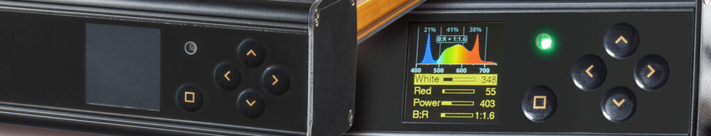 Dimlux LEDs come with an on-board display. It’s used to configure the light when operated stand-alone (no external controller) as well as display the current spectrum.​