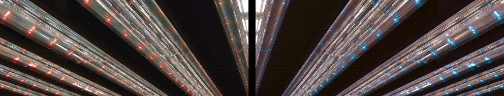 The white and red(s) LEDs are on separate channels and can be controlled independently. This allows the grower to change the spectrum of light that the plants are receiving.